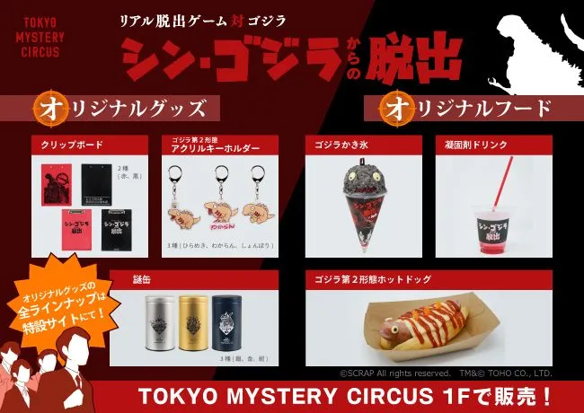 世界初・国内最大となる“謎”をテーマとしたテーマパーク「TOKYO MYSTERY CIRCUS(以下、東京ミステリーサーカス / 略称TMC)」は、映画「シン・ゴジラ」(脚本・総監督/庵野秀明)とコラボレーションしたイベント『シン・ゴジラからの脱出』の本イベント限定オリジナルグッズとフードの発売を決定いたしました。