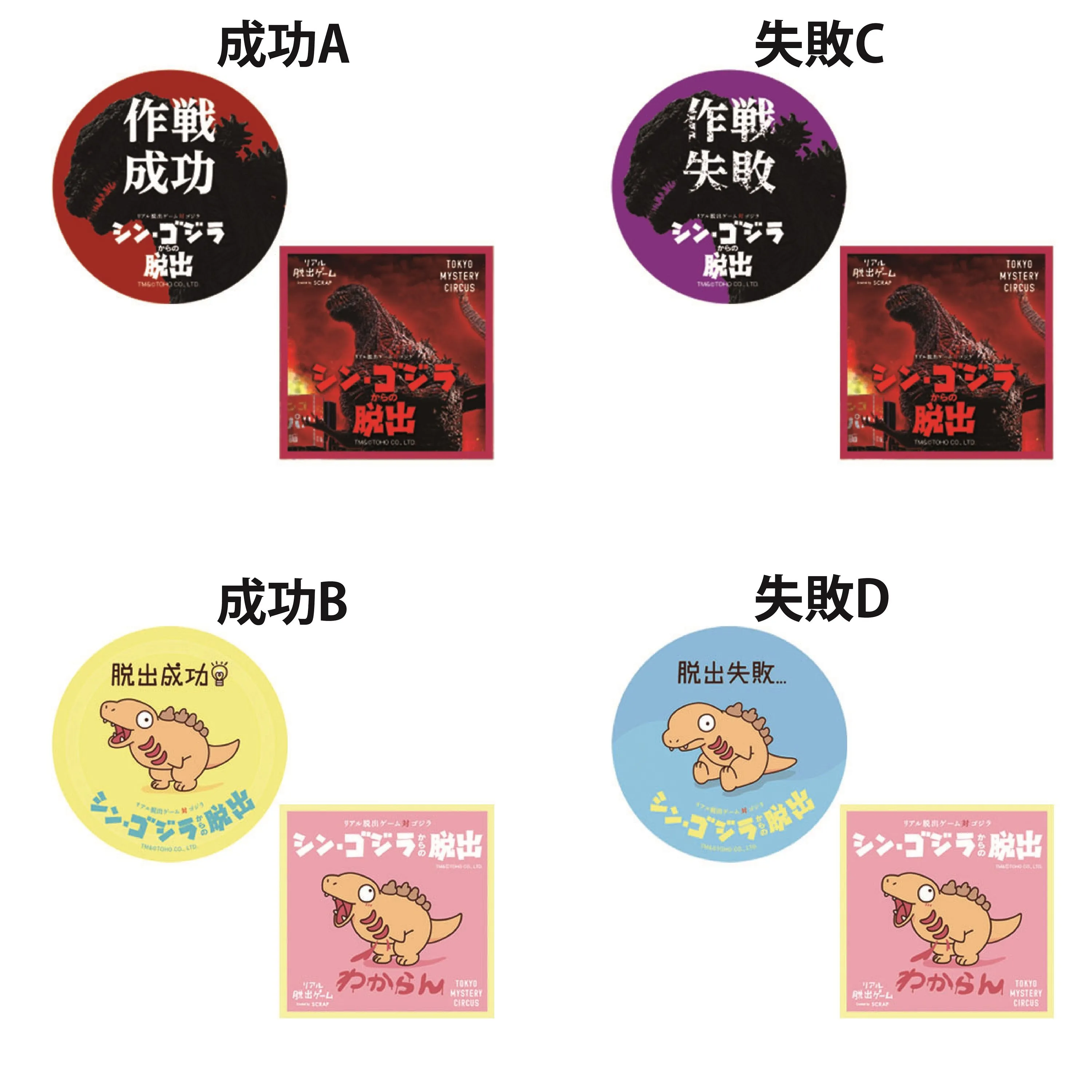 ◇脱出成功・失敗ステッカーセット(正方形ステッカー1枚付き) / 各300円(税込)・4種(成功A、成功B、失敗C、失敗D)