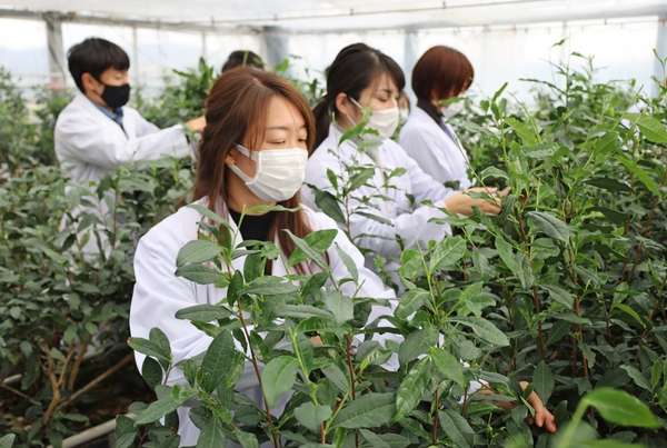 この研究成果の披露として、2023年1月5日に日本一早い新茶の初摘みを行い、摘んだお茶の葉は、茶の開祖 栄西禅師の像にお供えし、本年の茶業発展を祈願いたしました。