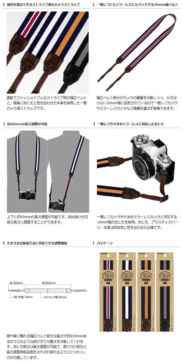 柔軟でファッショナブルなストライプ柄の幅広ベルトと、根革に先ヒモと色を合わせた本革を採用した一眼カメラ用ストラップです。首掛けも斜め掛けも可能な長さに調整することができます。