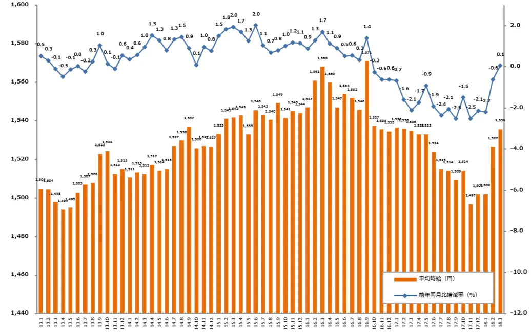 ■3月度の三大都市圏平均時給は、1,536円。18ヶ月ぶりに前年同月比プラス。