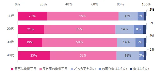 『エンウィメンズワーク』を利用している女性ユーザーに「転職活動において、仕事のやりがいを重視しますか?」と伺ったところ、78%の方が「はい(非常に重視する:23 %、まあまあ重視する:55%)」と回答しました。