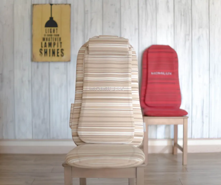 ストライプブラウンとストライプレッドの2色をご用意しました。背中パッドでもみ玉の強さを調節できます。