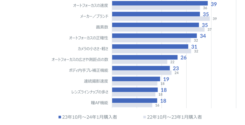 新製品には、被写体検出の種類の拡大や自動追尾などオートフォーカス機能の進化をうたったものが多く、ピント合わせが難しい鳥や飛行機など動きのある被写体の撮影にも対応できるようになっている。GfKが実施した調査で購入製品の重視点を聞いたところ、23年の結果では「ブランド」や「画素数」を上回って「オートフォーカスの速度」の回答が最も多かった(図2)。また、それ以外のオートフォーカス関連の項目(オートフォーカスの正確性、広さや測距点の数)も上位に上がってきており、直近のユーザーにおいてはオートフォーカス機能を重視・評価する傾向がみられた。