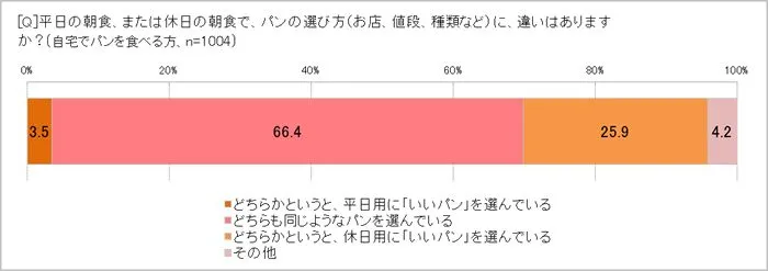 休日のパンの朝食は単に「食事」というだけではなく、<お休み気分>をアゲてくれる「イベント」に近いのかもしれません。そこに登場するパンは風味や素材も吟味したい、そんなマインドも感じられる調査でした。