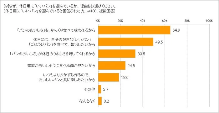 「朝食の主食(炭水化物)として、何を食べることが多いですか?」では、平日が「パンが多い」50.1%、「ごはんが多い」38.1%、休日が「パンが多い」58.8%、「ごはんが多い」27.8%という結果に。休日のパンの喫食率は8.7ポイントアップし、ごはん(米)は10.3ポイント下がります。また「休日の朝食と平日の朝食でパンの選び方に違いはありますか?」では、「どちらも同じ」という答えが66.4%で最多ではありましたが、次は「休日用に“いいパン”を選んでいる」で25.9%。さらに「なぜそうするか」を問うと「“パンのおいしさ”をゆっくり食べて味わえるから」64.9%、「休日には自分の好きな“いいパン”“ごほうびパン”を食べて贅沢したいから」49.5%、「“パンのおいしさ”が休日のうれしさを増してくれるから」33.5%などの理由が並びました。時間に追われない休日の朝食シーンでは、パンは1週間がんばった自分への「ごほうび」なのだということがうかがえる結果です。