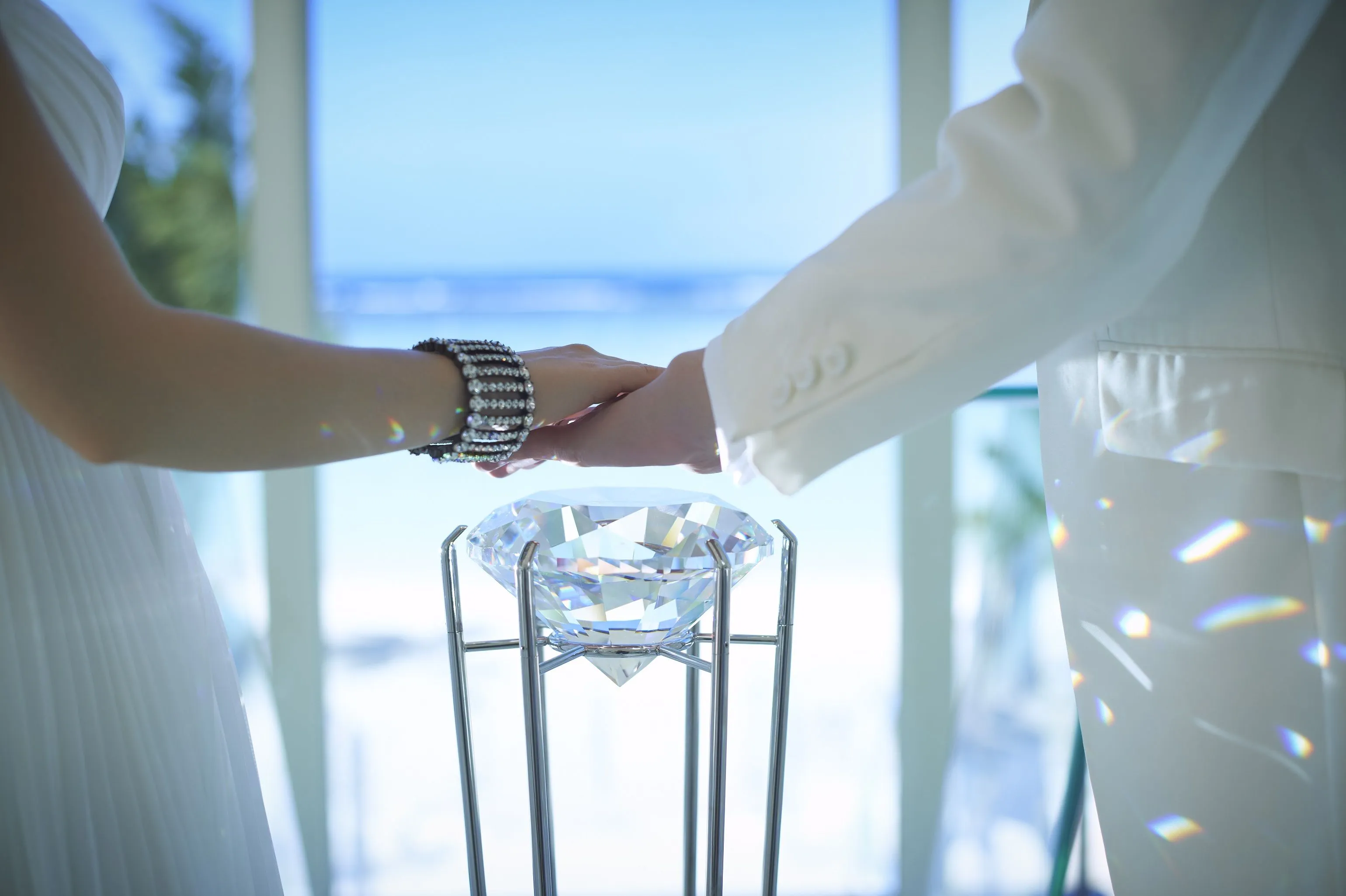 ダイヤモンドをかたどった“クリスタルアルター上で行うオリジナルセレモニー“ジュエルの誓い”では、クリスタルの上にお互いの手を重ね、祈りの言葉を胸に刻んでいただきます。