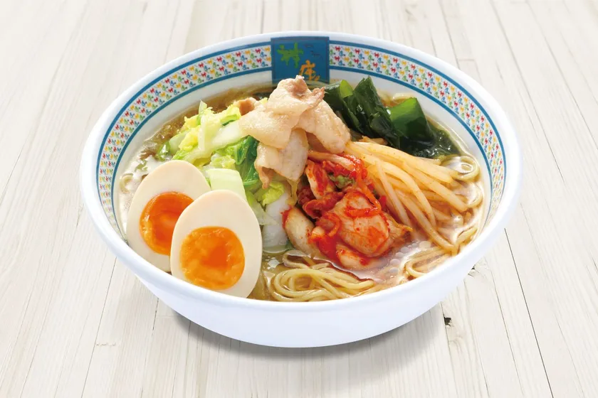 看板メニューの「おいしいラーメン」のスープをベース開発した冷製ラーメンです。かつおだしの旨みとゴマ油の香りをプラスした秘伝スープに、もやしナムル、ワカメ、豚肉、キムチ、煮卵、白菜ナムルの具材をのせました。なかなか食がすすまない暑い夏に、彩り鮮やかな冷たい麺で野菜がたっぷり食べられると女性に好評の冷麺です。