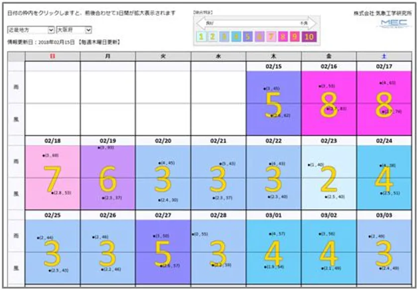 表示画面はカレンダースタイルで、各日の総合判定が10段階で表示され、数字が小さいほど好条件であることを示しているため、数字の並びから条件の良い日を選びやすくしたのが特長です。また、各日の枠内には「雨」と「風」それぞれの、過去と予報の情報を独立させて表示しているため、「雨」や「風」のどちらか一方を重視して日程を決めることが可能となります。