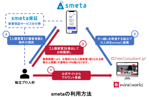 今回、フリーランスが抱える不動産賃貸領域における与信課題を解消し、豊かな生活を送れるよう支援していきたいという思いから、この度の提携に至りました。みらいワークスの「フリーコンサルタント.jp」の登録者は、当社アプリ「smeta」を通じて、賃貸住宅を借りるために必須となる信用(家賃保証サービス)と賃貸物件情報をワンストップで得られ、入居審査に落ちることなく賃貸住宅をご契約いただけます。