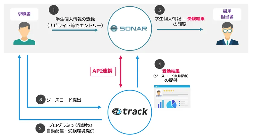 この度、新卒市場で400社以上の企業が利用しており、職種別選考のフロー設計をGUIベースで人事が簡単に作成できる採用管理システム「SONAR」とプログラミングスキルチェックツール「track」がAPI連携をすることで、今後、職種別選考を実現したい企業様が、工数をかけずに自社に最適なエンジニアを選考するフローを設計することが可能になりました。