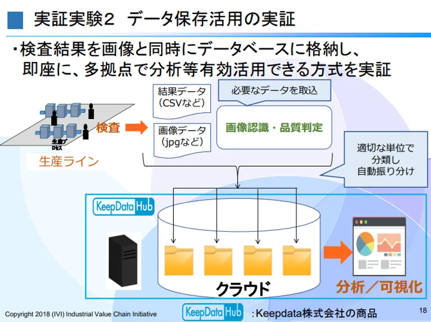 Keepdata株式会社(本社:東京都中央区、代表取締役:渋谷 紳一郎、以下 Keepdata)が開発するビッグデータ業務ソリューションKeepData Hubを、「Industrial Value Chain Initiative(以下 IVI)」のワーキンググループ「3C01:AI による生産ラインの生産性向上と自動化進展 ~第一弾;検査工程への取組み~」内の実証試験において、データ保存活用ツールとして試供させていただきました。