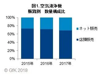 ・2017年の空気清浄機の販売数量は210万台。インターネット販売が数量構成比31%へ拡大