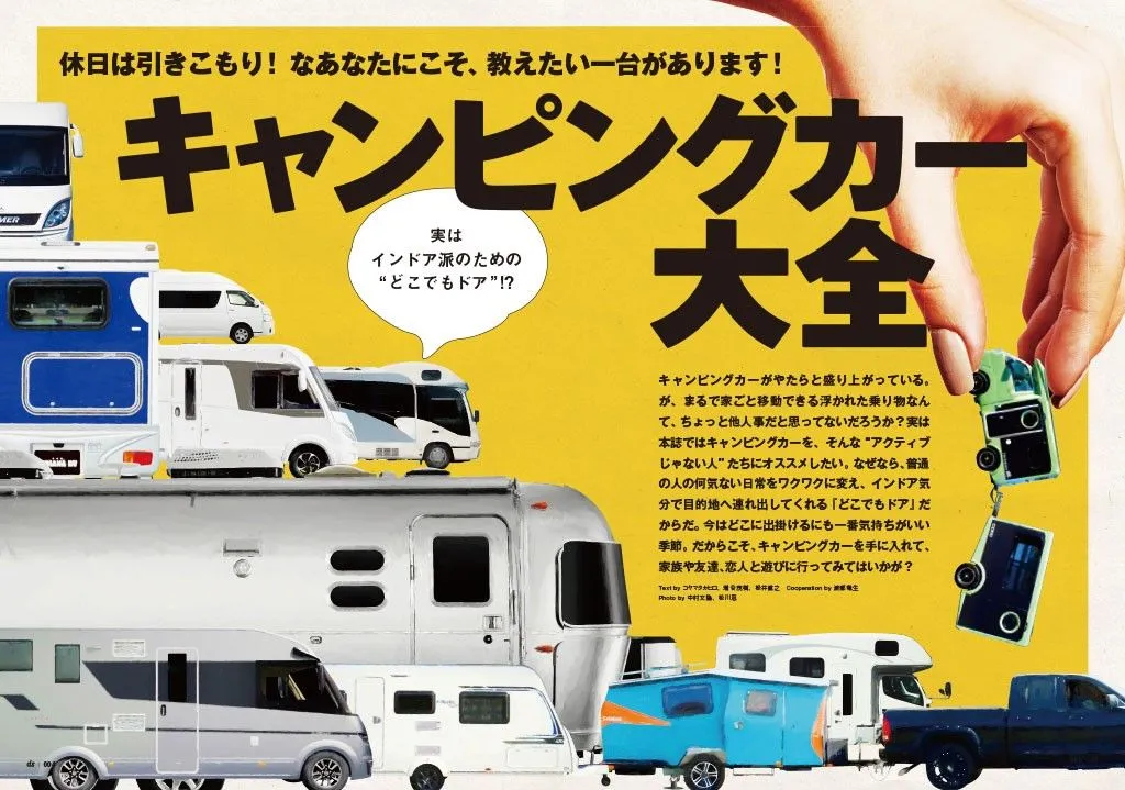キャンピングカーがやたらと盛り上がっている。が、まるで家ごと移動できる浮かれた乗り物なんて、ちょっと他人事だと思ってないだろうか? 実は本誌ではキャンピングカーを、そんな“アクティブじゃない人”たちにオススメしたい。なぜなら、普通 の人の何気ない日常をワクワクに変え、インドア気分で目的地へ連れ出してくれる『どこでもドア』だからだ。今はどこに出掛けるにも一番気持ちがいい季節。だからこそ、キャンピングカーを手に入れて、家族や友達、恋人と遊びに行ってみてはいかが?