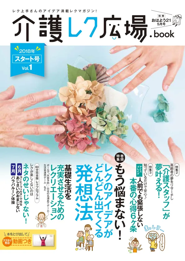 5月1日に発売されるスタート号では、介護現場での悩みの一つであるレクリエーションのマンネリ化に対して、アイディアがどんどん出てくる発想法や、基礎生活を充実させるためのレクリエーションを紹介。日常を楽しく過ごすためのヒントを多数掲載しています。永久保存版としてお使いいただける一冊となっています。