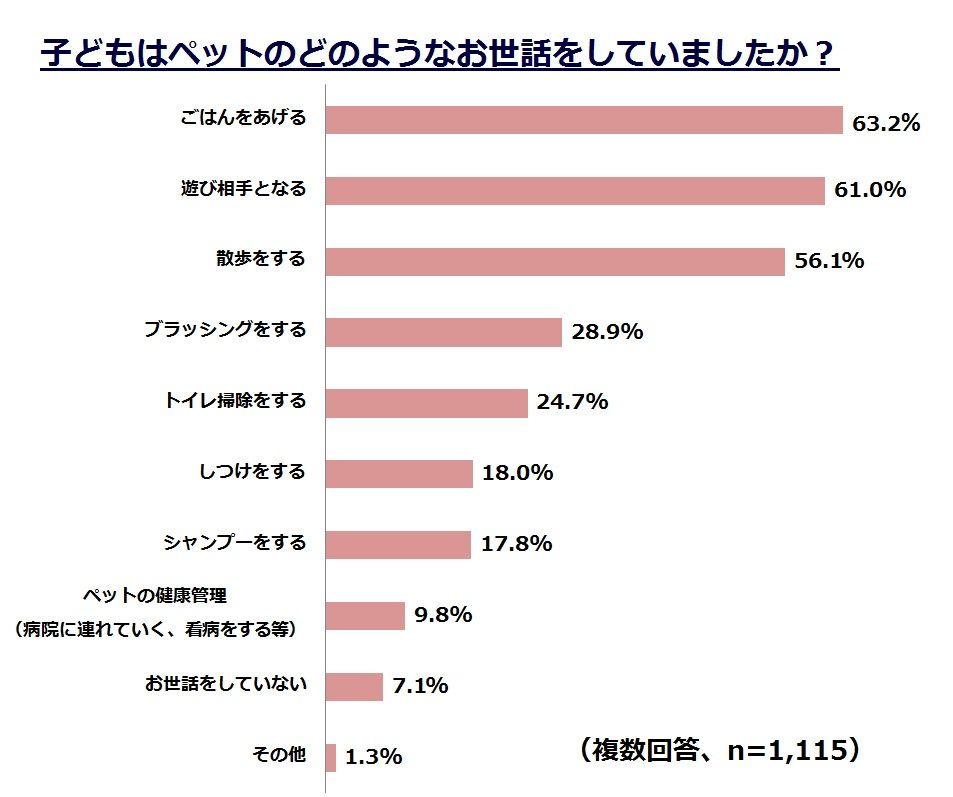 続いて、お子さんがどのようなお世話をしていたかお聞きしたところ、「ごはんをあげる」(63.1%)が1位となり、以下、「遊び相手となる」(61.0%)、「散歩をする」(56.1%)となり、日常的にペットのお世話をしていることが伺えます。