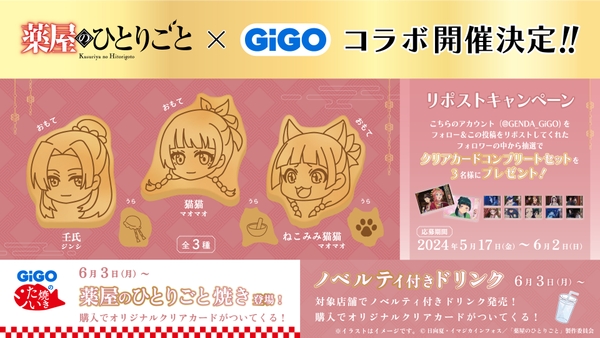 株式会社GENDA GiGO Entertainment(本社:東京都港区 代表取締役社長:二宮 一浩 以下、当社)は、TVアニメ『薬屋のひとりごと』とのコラボレーションキャンペーンを2024年6月3日(月)よりGiGOグループの店舗で開催いたします。