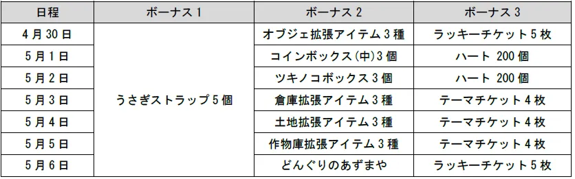 ■内容:期間中に別途実施されるイベントや、ログインボーナスなどでアイテム「うさぎストラップ」を獲得することができます。「うさぎストラップ」を一定数集めると、その個数に応じたイベント特典アイテムと交換することができます。