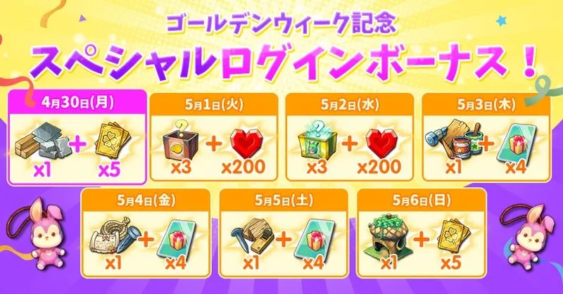 ■内容:ゴールデンウィーク期間中に、ログインするだけでスペシャルログインボーナスを獲得できます。ログインボーナスは、午前0時00分に内容が切り替わります。