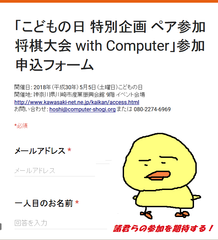 こちらのペア参加将棋大会はこどもの日ということもあって親子や孫とのペアが参加しやすい内容ですが友人同士、兄弟姉妹、カップル、その他でも参加が可能となっており、申込は世界コンピュータ将棋選手権イベントサイトから可能です。授乳スペースも用意予定なので、お子様連れも気楽にお越しいただけます。また、事前に世界コンピュータ将棋大会特設サイト内で棋力をチェックすることが出来るようになっており、そちらでペアの棋力を報告してからの登録方法もユニークです。
