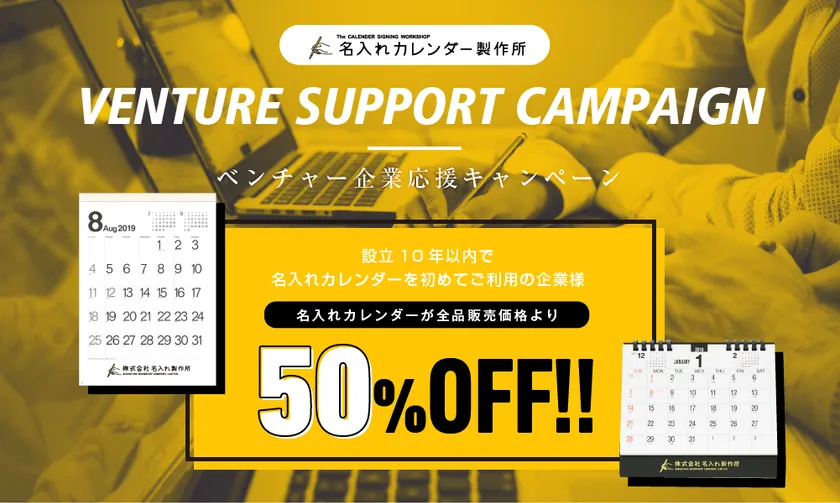 株式会社名入れ製作所(代表取締役:大脇 晋、本社:大阪府西区)は、設立10年以内のベンチャー企業を対象に、名入れカレンダーを50%OFFでご注文いただけるキャンペーンを実施いたします。