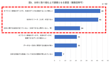 分析に取り組む上で課題となる要因として、「オフライン領域のデータや、外部のデータを収集することが難しい」が最も多く挙げられ、次いで「社内のリソース(人手)が足りない」「分析に関する知見が足りていない(分析できる人間がいない、等)」が多く挙げられました(図5赤枠部分)。