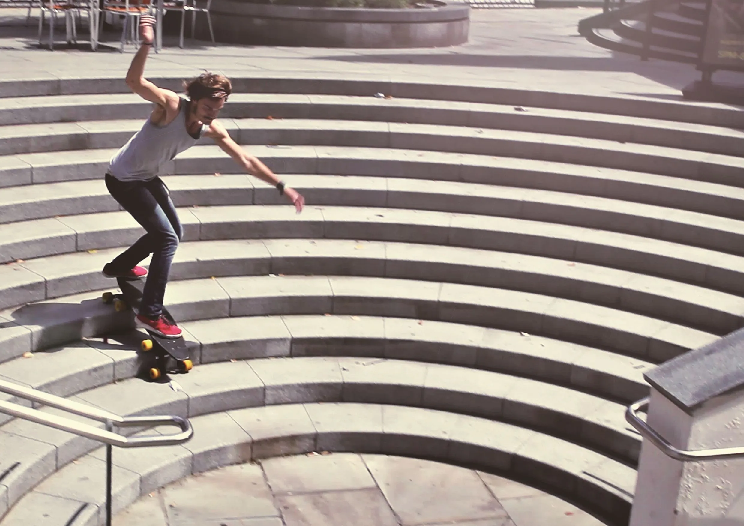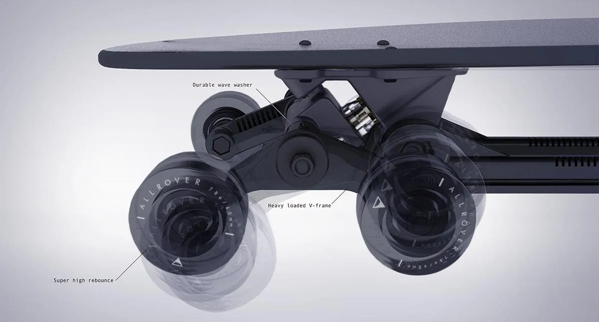 特許技術で開発した「V-frame(V-フレーム)」と8個のウィールを上下少しずつずらして配置することで、その8個のウィールは独立して上下に跳ね上がり、階段の形状に適合しながらスムーズに降りてゆきます。スケーターとなったあなたはただボードに預けた自分の重心をキープするだけで、階段をなんなく乗りこなすことができます。