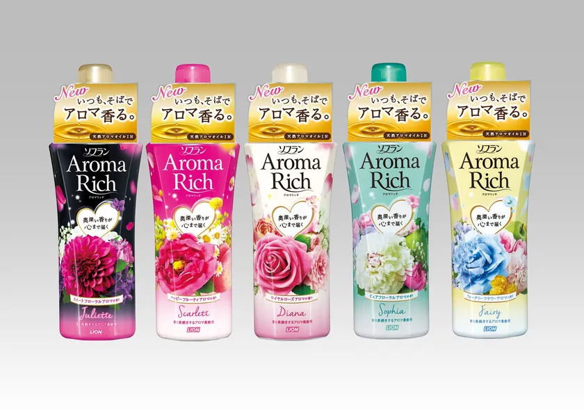 近年、女性の生き方・働き方が多様化する一方で、多くの方が自分のリズムが保てていないと感じています。そして、日々の生活で自分らしさを保つ手段の1つとして、“香り”が重要視されてきています。『ソフラン アロマリッチ』は、そのような女性達の嗜好を捉えた5つの香りをラインアップしています。