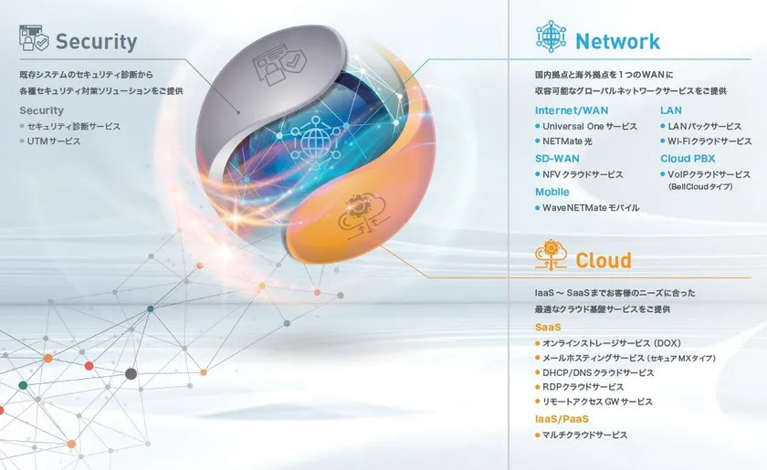 “WaveNETMate”は、企業ネットワーク(WAN/LAN)、クラウドサービス、セキュリティサービスをワンストップで提供する総合ネットワークサービスです。拠点間ネットワークのコスト削減や信頼性向上、社内LAN構築/運用の負荷低減、ネットワーク運用/監視のアウトソース等の課題解決に向け、国内外を問わず最適な環境を提案します。