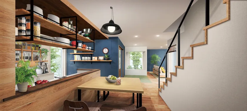 ・大好きなモノに囲まれたい!を叶えるため、見せる収納(シェルフ)やレトロな雰囲気のペンダントライトを標準装備。