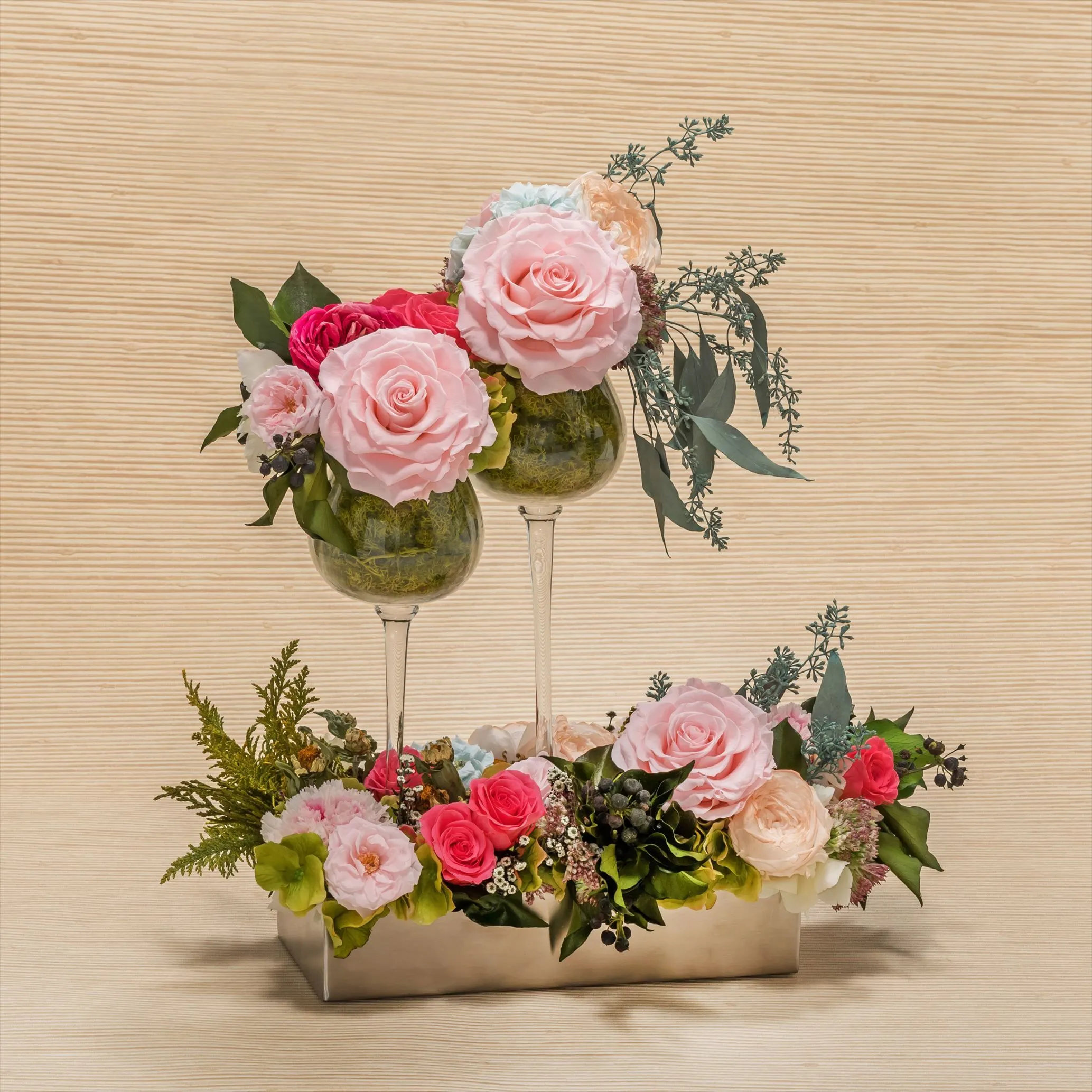 ムーラン・ド・ラ・ギャレットはパリのモンマルトルにあったダンスホールです。木陰で語り合う5人の男女を描いたピエール=オーギュスト・ルノワールの「庭にて、ムーラン・ド・ラ・ギャレットの木陰」の作品からインスピレーションを受け、「幸せなひととき」をピンクのプリザーブドローズとプリザ―ブドグリーン、アイランドモス等を使って表現しています。
