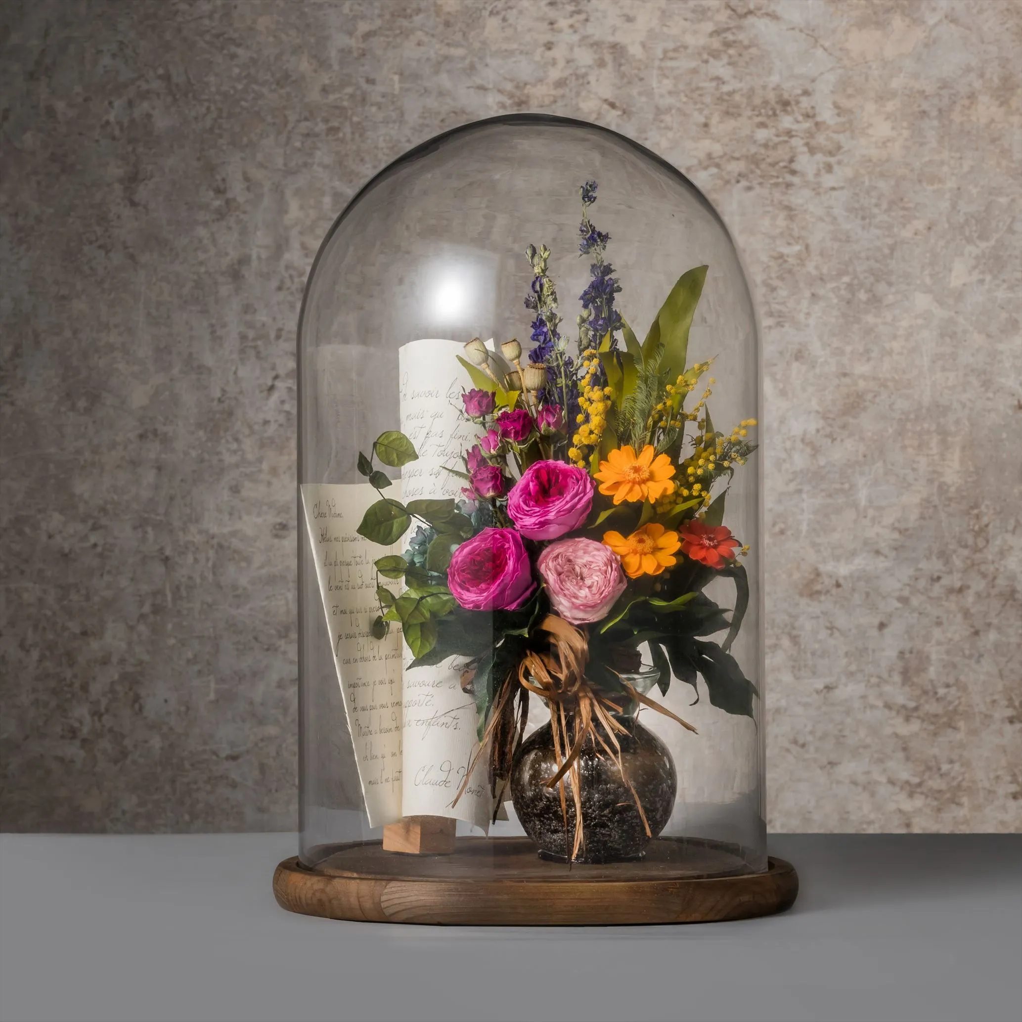 内容:プリザーブドフラワー(バラ、ジニア、アジサイ、グリーン)、ドライフラワー(バラ、ミモザ、ポピーの実、デルフィニウム、グリーン)、ガラス製ドーム(木製ベース付き)、ガラス製花器、ウッドカードホルダー、ラフィア、ペーパーレター