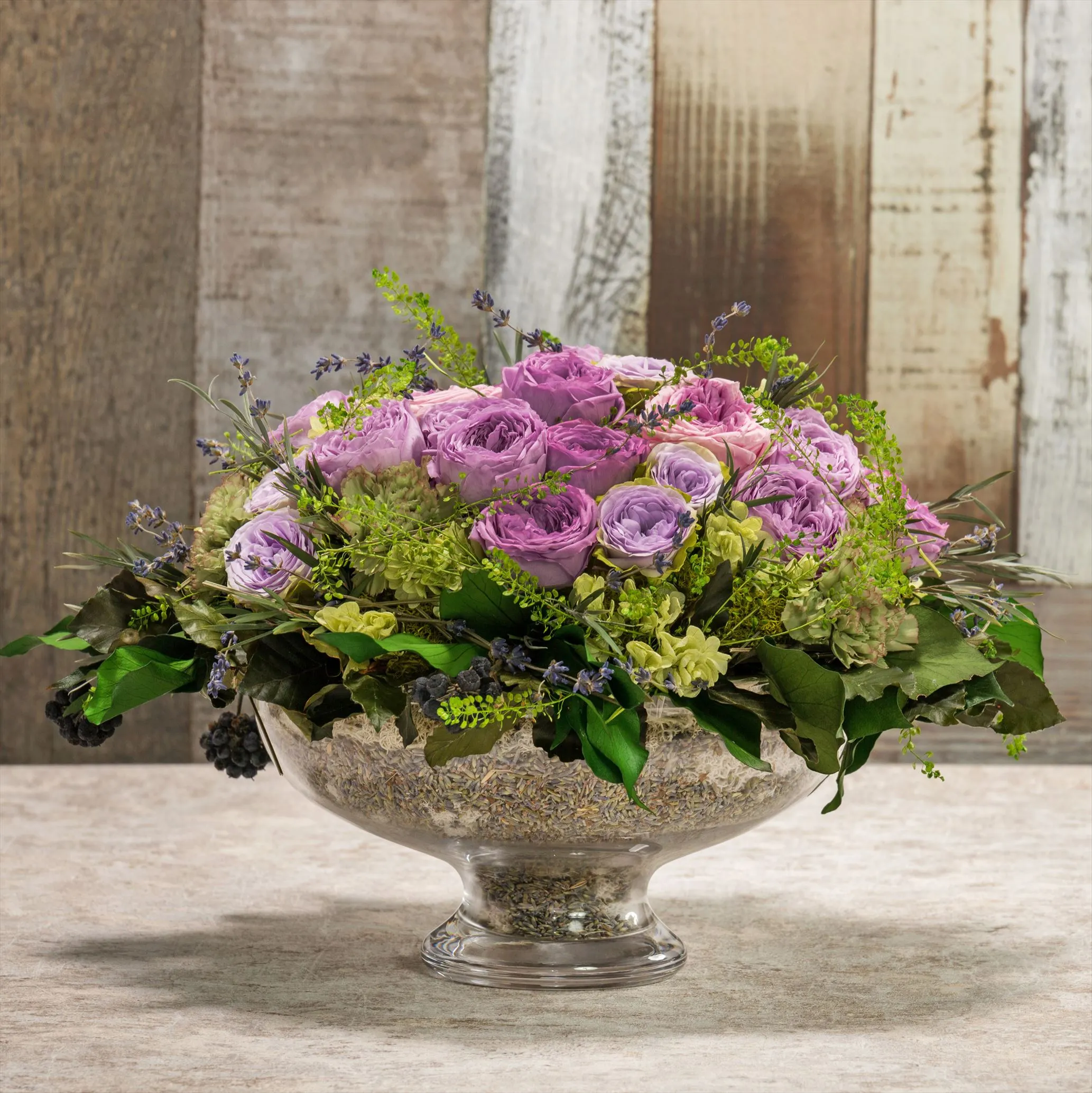 夏の南フランスに、見渡す限り広がるラベンダー畑。まばゆい光に包まれて、黄色いヒマワリやピンクのブーゲンビリアなど色とりどりの花々が咲き乱れ、空の青と美しいコントラストを描きます。多くの芸術家を引き付けた南仏の空気感を、ラベンダーにフィーチャーし、プリザーブドローズ、プリザーブドグリーンと、ドライフラワーのラベンダーを使って表現したアレンジメントです。