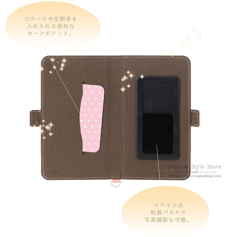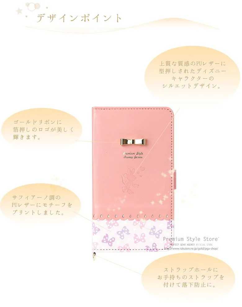 大人かわいいディズニーキャラクターがコンセプトの「Premium Style Disney series」からiPhone 8/7/6s/6用で大人気のデザインの多機種スマートフォン対応マルチフリップタイプを発売致します。ゴールドリボンと型押しで表現されたキュートで高級感のあるデザイン。ガラス筐体にも貼れるよう下貼りフィルム付きでスマートフォンとの粘着強度をUPします。スライド式の粘着パネルで写真撮影も楽々。内側にカードポケット付き。ストラップ用リングにお手持ちのストラップを付けて落下防止に。