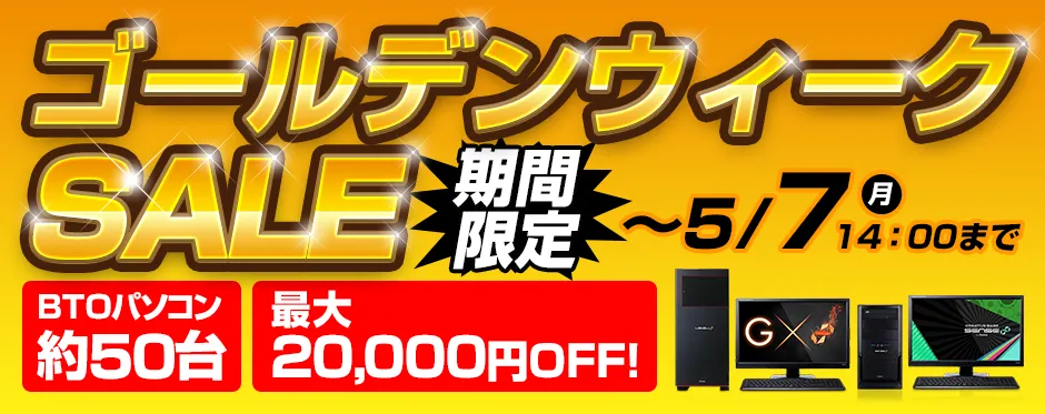 『ゴールデンウィークSALE』では、約50機種のBTOパソコンが期間限定で最大20,000円OFF!