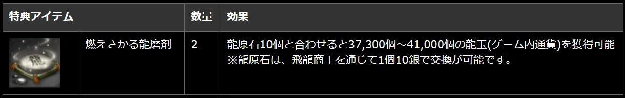 さらに、この「燃えさかる龍磨剤」2個のシリアルコードを2018年4月25日(水)定期メンテナンス終了後~2018年5月23日(水)定期メンテナンス開始前の期間中にご利用頂くと、 2018年5月30日(水)定期メンテナンス終了後~2018年6月27日(水)定期メンテナンス開始前の期間、「燃えさかる龍磨剤」を2個まで半額で購入できるキャンペーンを実施!