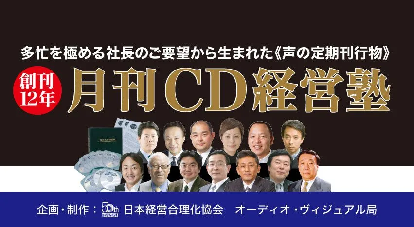 月刊CD経営塾は、多忙を極め、決断の連続である経営者からの要望に応えて創刊された声の定期刊行物です。社長の実務に特化し、毎回、必聴の経営情報だけを厳選、一流の講師陣による「速報収録CD」による生きた知恵と社長必読の「旬のおすすめ書籍」、日本の立ち位置を知る「経営レポート」をあわせ、お手元にお届けします。