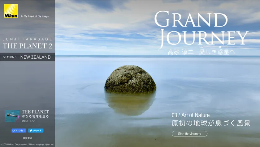全12回にわたってお届けする「THE PLANET 2」第3回のテーマは「Art of Nature 原初の地球が息づく風景」です。デジタル一眼レフカメラ「ニコン D5」「ニコン D850」を用いて、ニュージーランドで出合った地球の創生を思わせる風景や鉱物、地衣類、植物、造形物などによって自然が生み出した芸術作品の数々を撮影しています。写真集をめくるようなイメージで、ニコンのテクノロジーと高砂氏の豊かな感性が融合した作品によるストーリーをお楽しみいただけます。