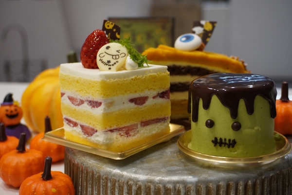 三種のチーズ、カマンベール、リコッタ、クリームチーズの濃厚なフロマージュをベース(さらに内にはフリュイルージュのアクセントが入っています)に抹茶クリームとチョコでフランケンに変身させました。見た目と味のギャップをお楽しみください。他にハロウィーンパンプキン、ハロウィーン苺ショートのLINEUP
