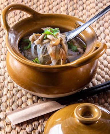 トムヤム“クン(海老)”ならぬトムヤム“ガイ(鶏)”。キノコと鶏肉の激辛ハーブスープ。仏教国タイでは肉やアルコールなどを摂取しないで精進料理だけをいただく菜食期間「キンジェー」がありますが、自由が丘セレブが夏に向けて「キンジェー」風ダイエットを提案。低カロリーで食物繊維が豊富なシメジ・エリンギや春雨をたっぷり使ったスープは、ココナッツ不使用なのでさらりとしていて重くありません。タイのハーブもたっぷり使っているので、爽やかな香りに包まれます。カプサイシンもかなり入っているので、発汗作用も期待でき、ダイエット中の女性に特におすすめです。