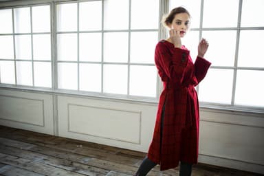 この他にも、留学していた頃を回顧しコレクションに反映させた全6型を製作。真っ赤なタータンチェックのコートや清楚な印象ながらもサイドに大きくスリットが入ったワンピースもオリジナルテキスタイルからデザインしています。