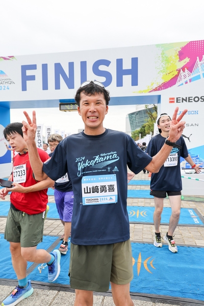 競歩で42.195キロを完走した山﨑さんは「すごく楽しい42.195キロで、終わってみればあっという間でしたね。序盤はちょっと暑いなと思ったんですけど、後半は曇ってきたので比較的走りやすいコンディションでしたね」と振り返り、「高速道路もそうなんですけど、横浜の街並みが僕はすごく好きなので、とても気持ちよく歩かせていただきました」と2年続けて歩いてみての『横浜マラソン』の魅力を語ってくれました。また、「他のランナーの方から『競歩すごいな』って声がいっぱいあったのも嬉しかったです。給水ポイントで取れなかった時があったんですけど、他の方から渡してもらったりしたので、そういう助け合いって素晴らしいなというのも感じました」と語ってくれました。