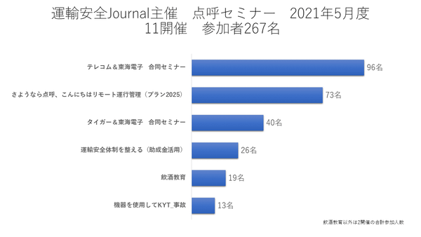 IT点呼システム及びアルコール検知器を開発販売する東海電子株式会社(本社:静岡県富士市代表取締役:杉本 哲也)は、この度、運輸事業者・運⾏管理者向けウェブセミナーの5⽉度開催(11開催合計267名様のご参加)によるアンケート結果をお知らせ致します。