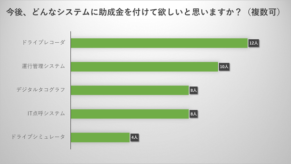⼀⽅で、助成制度があるのを知りながらも、例えば⾎圧計については、「点呼規則が改正されれば考える」という回答が75%もありました。お⾦の問題ではなく、「義務ではないから、後でも」との感覚が⾒受けられます。