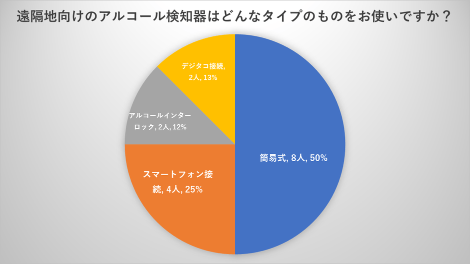 出発後の飲酒管理については、スマートフォン接続タイプが主流かと思いきや、まだ5割が、簡易式のアルコールチェッカーを利⽤しているようです。