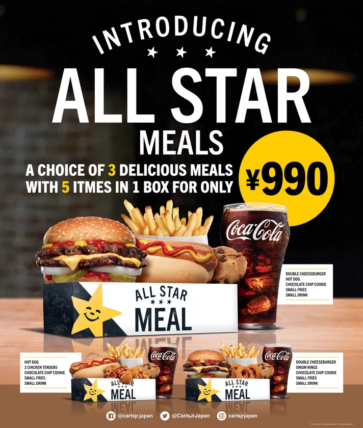 「ALL STAR MEAL」は、昨年より世界各国約3,900店舗のカールスジュニアで順次展開を開始している新メニューで、それぞれの国ごとに独自の組合せを1つのボックスに詰め合わせたボックスメニューです。日本では、「GET UNHUNGRY JAPAN!」をコンセプトに、3種類のボックスメニューをそれぞれ990円(税込み)でご用意し、お客様のお好みに合わせて選んでいただけるようになっています。各ボックスの内容は以下の通り。