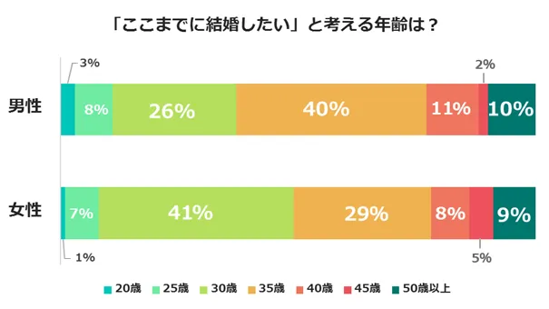 『自分はこの年齢までには結婚したい、という年齢はいくつですか』という質問では「30歳」「35歳」という回答が多く、回答者全体の8割近くが30代には結婚パートナーを得たいと考えていました。