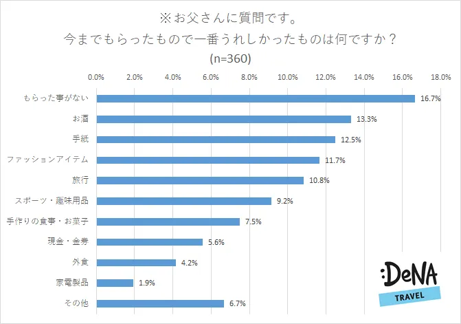 お父さんに今までもらったもので一番うれしかったものは何か聞いたところ、残念ながら「もらった事がない」(16.7%)が最も多い回答となりました。