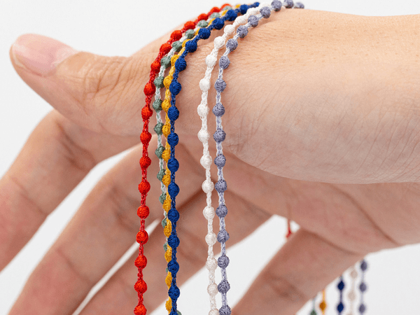 留め具まで糸で出来ているので、金属アレルギーをお持ちの方も、安心して身につけて頂けます。