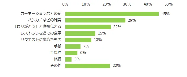 母の日や父の日にプレゼントするものを伺いました。母の日は「カーネーションなどの花」(45%)がもっとも多くの支持を集めました。「その他」(22%)と回答した方の多くは、スイーツや商品券をプレゼントすると回答しています。